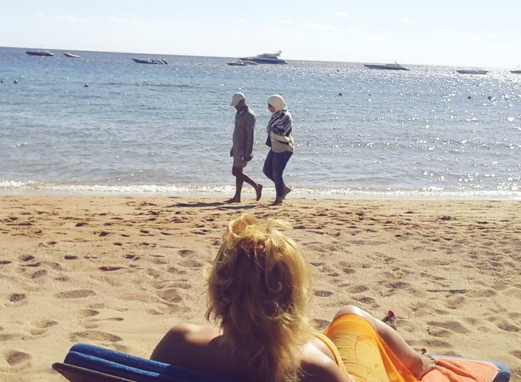 Одна интернациональная - он высокий нордической внешности раздетый в шотах скандинав (!), а она - маленькая нежная китайка или из того азиатского направления... кутающаяся по самую шею в декабрьском 28-ми градусном Египте.