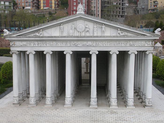 "Его отделка поражала воображение, а особым украшением стала знаменитая колоннада из 127 колонн, каждая из которых была подарком от эллинского царя. Большая статуя Артемиды была сделана из золота и слоновой кости. Однако, храм в первоначальном виде не простоял и двухсот лет – в 356 году до н. э. его сжег безумец Герострат.""