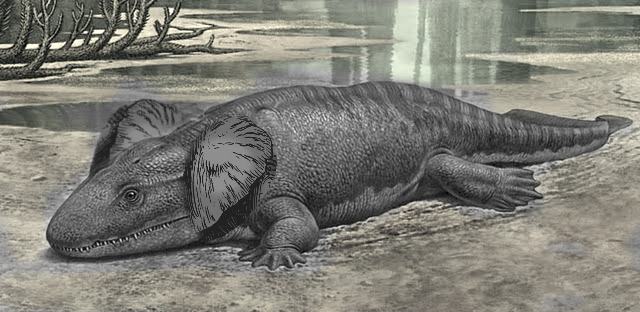Затем, постепенно, в темноте, проявилась картинка серой лапы какого-то существа и само существо, серое, с чешуей, лапами  и хвостом как у крокодила. Но голова была странной – на голове были большие уши как у слоненка))