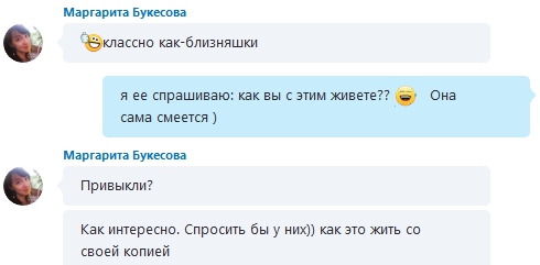 В офисе был казус. Среди клиенток есть у меня одни близняшки. Две женщины уже взрослые, и они со мной уже 13 лет. Месяц назад была одна, сегодня за документами пришла – я тоже думала, что она)). Целых полчаса обращалась к ней Наташа, пока она уж не выдержала и тихонько говорит: Я Таня…