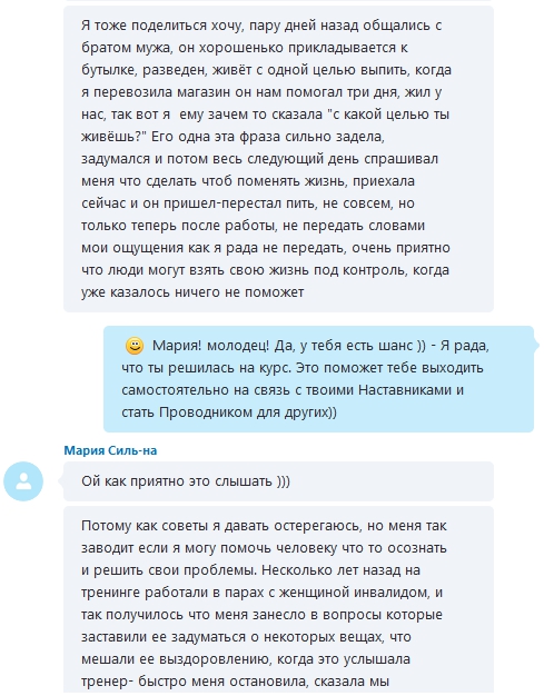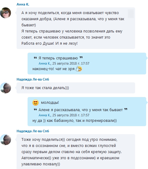 Создаётся впечатление, что это личный дневник, где душа искренне делится с родными душами своими инсайтами, идеями, выводами и плодами практик, размышлений! Давно у меня не было такого момента глубокого погружения в такую родную, духовную атмосферу! Благодарю Вас всех! Ещё рассылки не успела прочесть :-)
