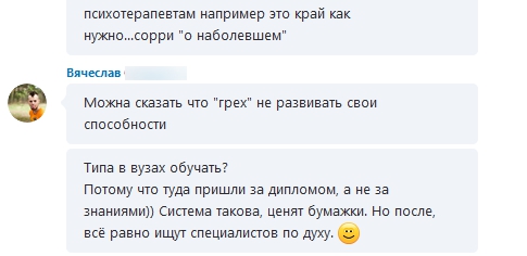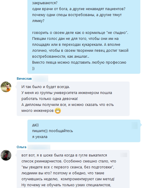 и в целом откатан курс, где за 4 месяца происходит созревание мозгов в сторону своей самоценности, профессионализма,и я всегда говорю курсантам не бросать свои работы, но развивать свой параллельный психоло-консультативный регрессионный проектстать мастером, востребованным, ценным, качественным - и это "таблетка от претензий к жизни" -
