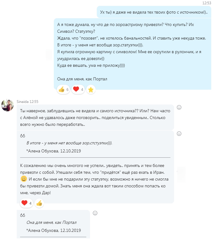Я полагаю, что и Алёна "потерялась" там не случайно. Даже меня от неё увели, чтобы что то важное передать именно ей (непосвящённой в тему зороастризма). Я же ушла вниз, к источнику.