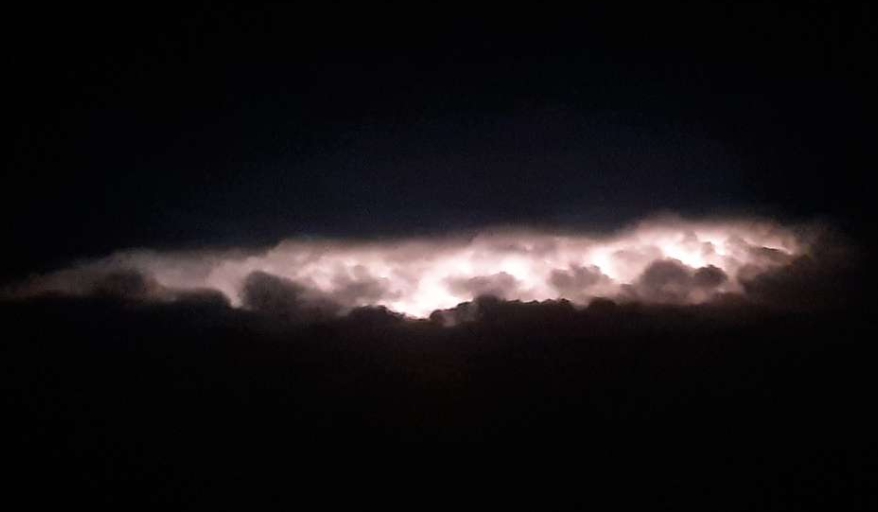В черном небе огромные километровые вспышки молнии как подсветка туч, и наш маленький самолетик в них .. лупануть могло..