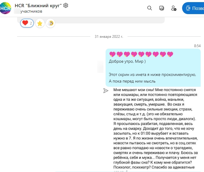В одной из открытых пси-групп девушка пишет о мучающих снах, непонятных ситуациях, в которых она не была, но они приходят в ее реальность,
