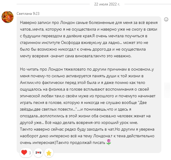 Светлана, вы пишите так поэтично и образно! Не уходите из этого чата, у вас классные посты, я всегда восхищаюсь и преклоняюсь перед людьми, которые умеют то, что не умею я, ц которых что-то получается играючи. Это прямо вау!
