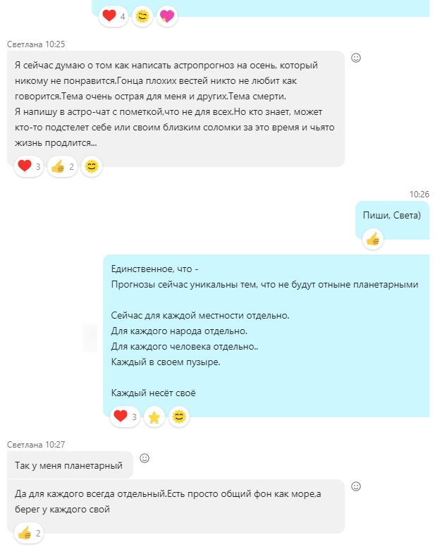 Я ж не профи(у меня нет такого образования),а просто любитель-самоучка, поэтому изучаю только те темы в астрологии,что интересны в конкретный момент жизни.Поэтому к моим прогнозам можно относиться несерьёзно -мой стаж самоучки всего 8лет.