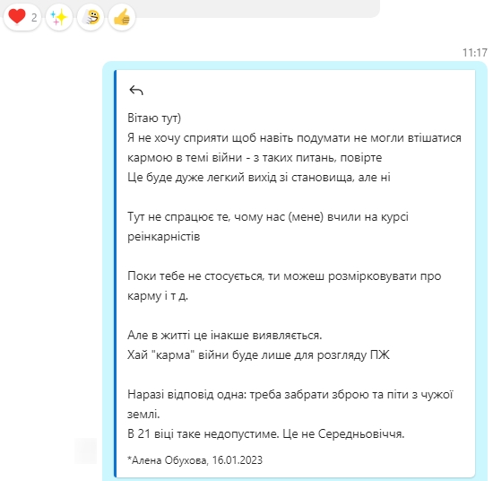 Алена Обухова: Приветствую здесь) Я не хочу содействовать чтобы даже подумать не могли наслаждаться кармой в теме войны - по таким вопросам, поверьте Это будет очень легкий выход из положения, но нет