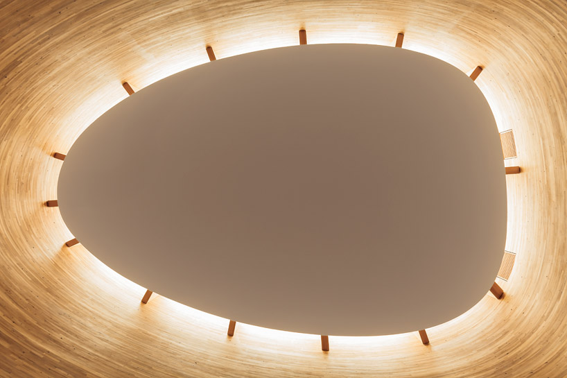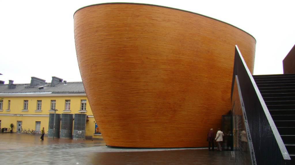 Материал - дерево нежно-оранжевого цвета – как встающее зарево солнца. В пасмурные 360 дней в этой финской местности, наверное, самое то.