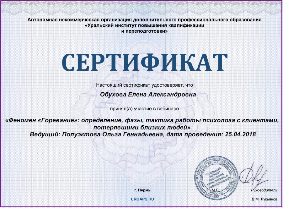 • (моя учеба) Сертификационное занятие «Феномен горевания: работа с потерей близких»