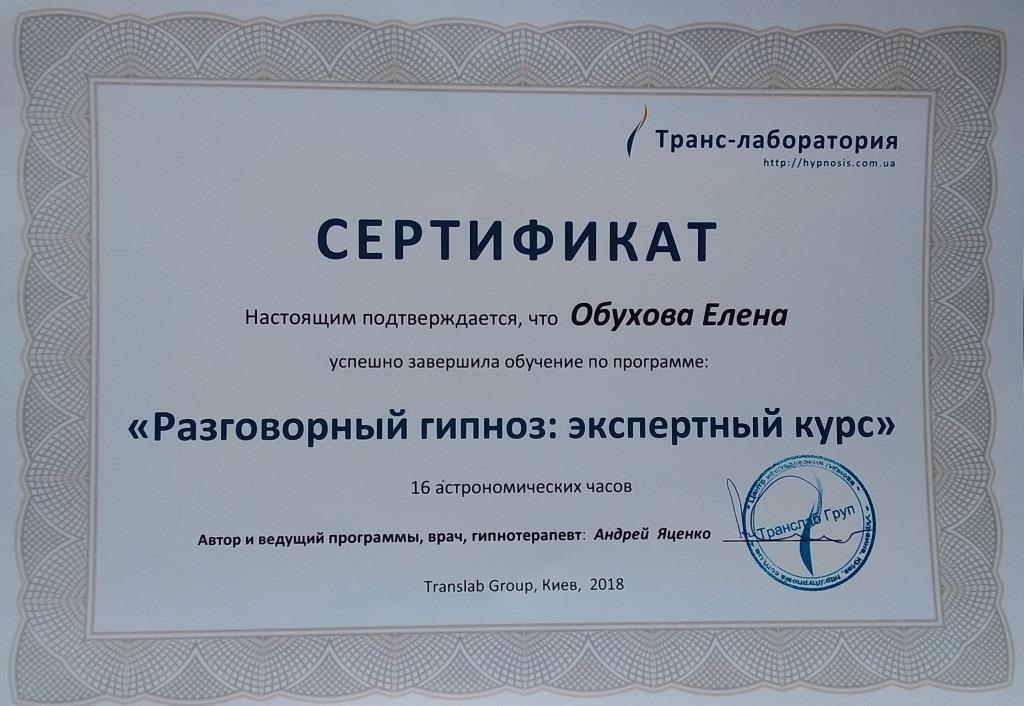(моя учеба) сертификат: разговорный гипноз /для экспертов