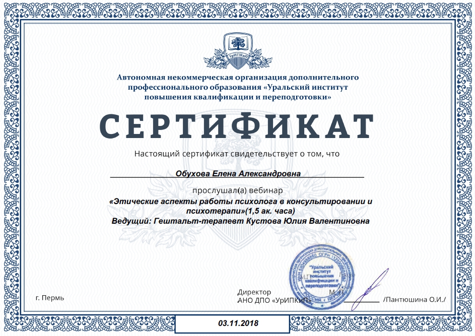 (моя учеба) три сертификата, в т.ч.: "этические аспекты в консультировании и психотерапии" и другие