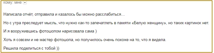 Приблизилась. Вижу женщину в профиль, она совершенно белая и от нее исходит очень сильное белое свечение, белый цвет был настолько плотным, что казалось, что её физически можно потрогать.