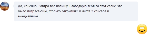 Я четко понимаю, чего я хочу и готовлюсь к переменам. Надеюсь, внутренние звоночки к которым я обещала прислушиваться после этого сеанса подскажут правильный путь и все организуется самым лучшим образом для меня.