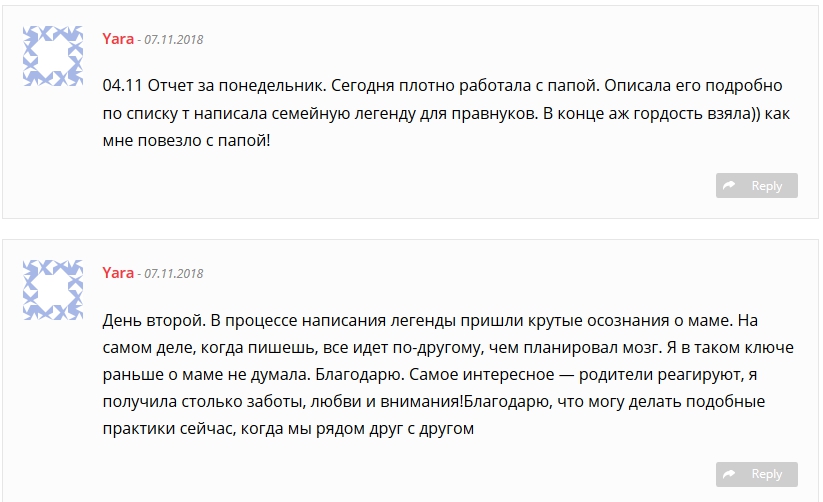 Пока рано говорить, так как прошло мало времени, но мне кажется, я стала более осознанно относиться к своим детям как к продолжению моего рода. И более бережно к родителям, пришло сильное ощущение их огромной важности в моей жизни. Спасибо за программу, за удивительную неделю работы с собой!