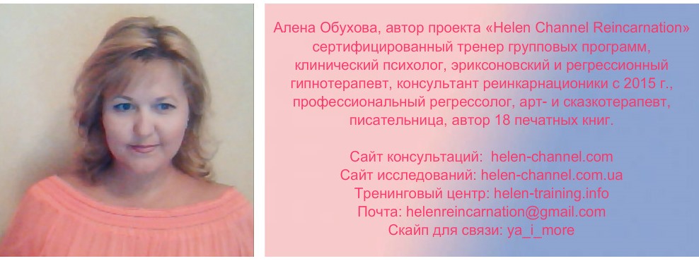 Здравствуйте, мои прекрасные читатели со всего Мира. С вами Алена Обухова, автор проекта, консультант реинкарнационики, профессиональный регрессолог, клинический (медицинский) психолог, сертифицированный арт- и сказкотерапевт, энергопрактик, ченнелер, эриксоновский и регрессионный гипнотерапевт, писательница.